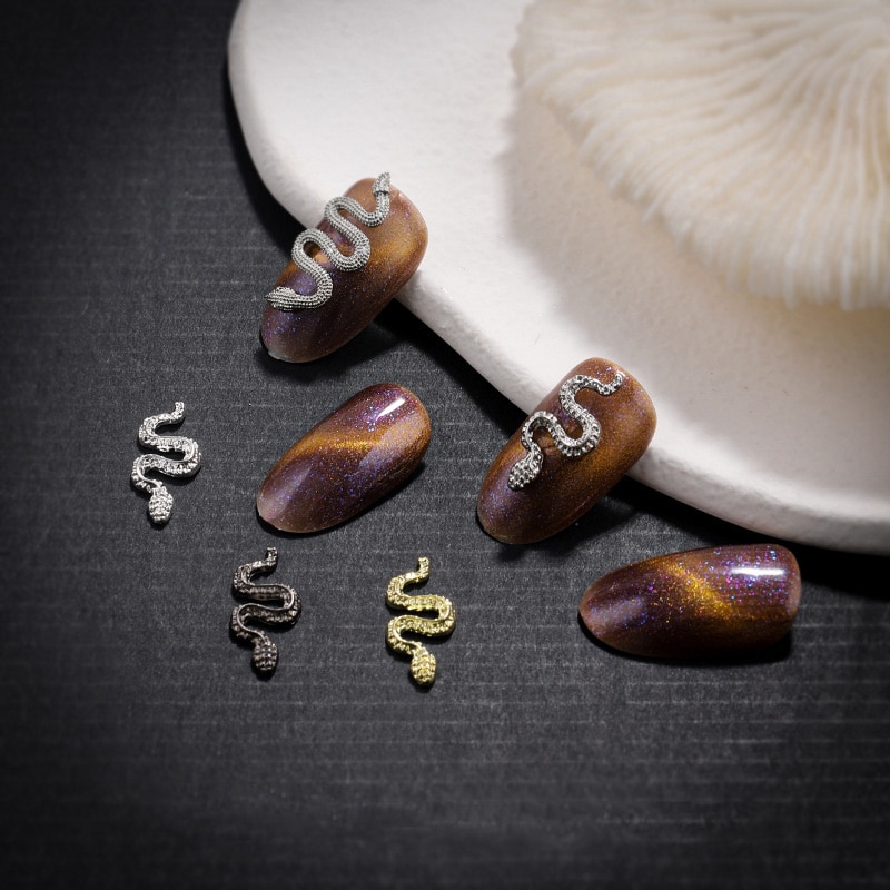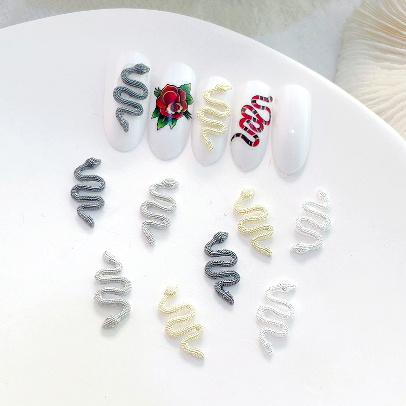 This set of 10 retro alloy snake wave metal nail jewelry accessories is 100% new brand and high quality. These charms are suitable to use on top of nail polish, UV builder gel, acrylic, and more, making them perfect for any nail art enthusiast. They are easy to apply on natural or artificial nails and can be used for both home use and professional settings. Not only are these charms beautiful and cute, but they are also high quality, portable, and durable, ensuring they will last through many uses. To use, simply clean the surface of your nails, brush on the base polish, and place the charm onto your nails. Add a unique and stylish touch to your nails with our Snake 3D Nail Charms. Order yours today and take your nail art to the next level!